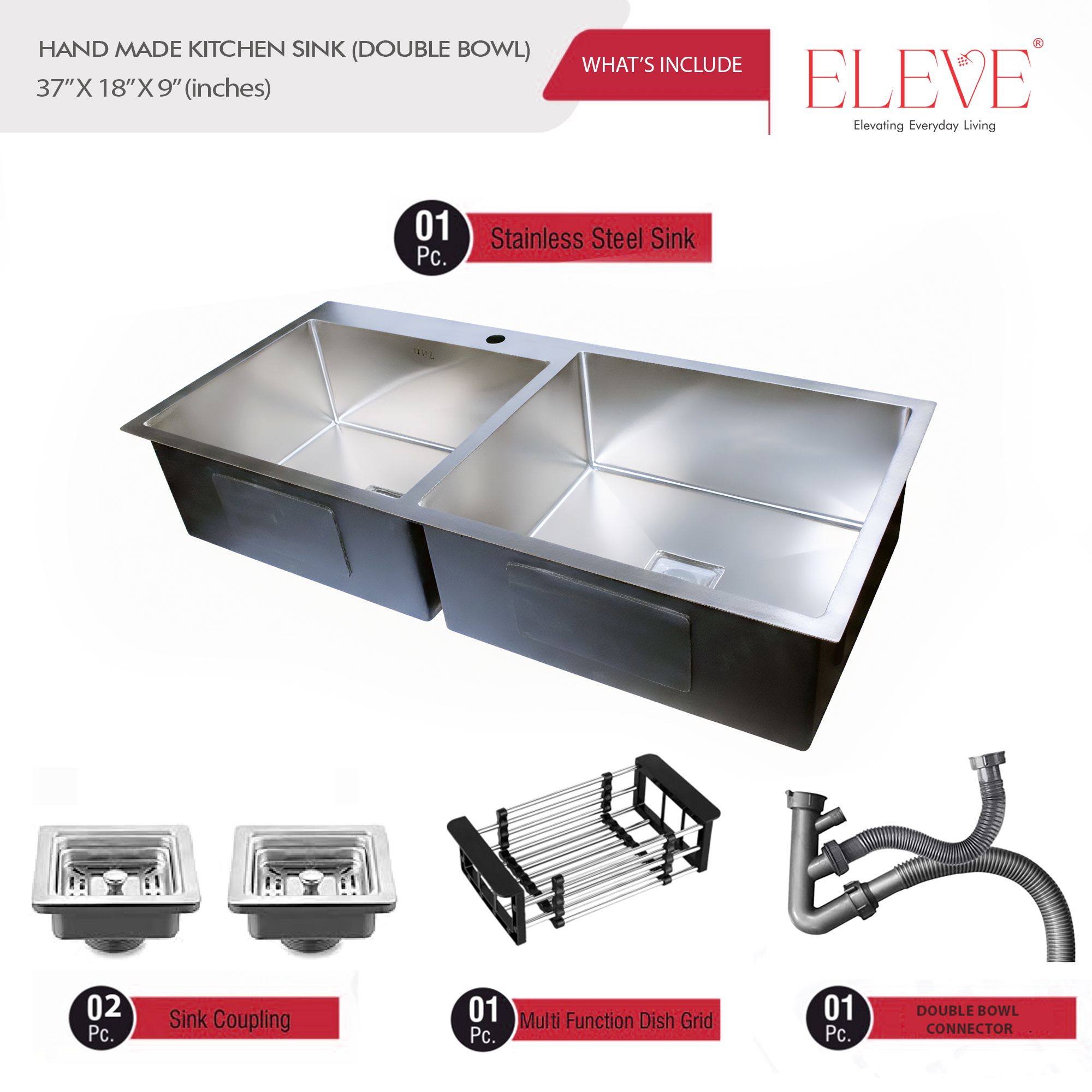 - Upgrade your kitchen with the ELEVE Opus 37”x18” Double Bowl Sink, designed with dual equal bowls and a built-in tap hole for maximum functionality. Crafted from premium 304 stainless steel, this handmade sink offers durability, scratch resistance, and a modern brushed finish—perfect for modular kitchens.