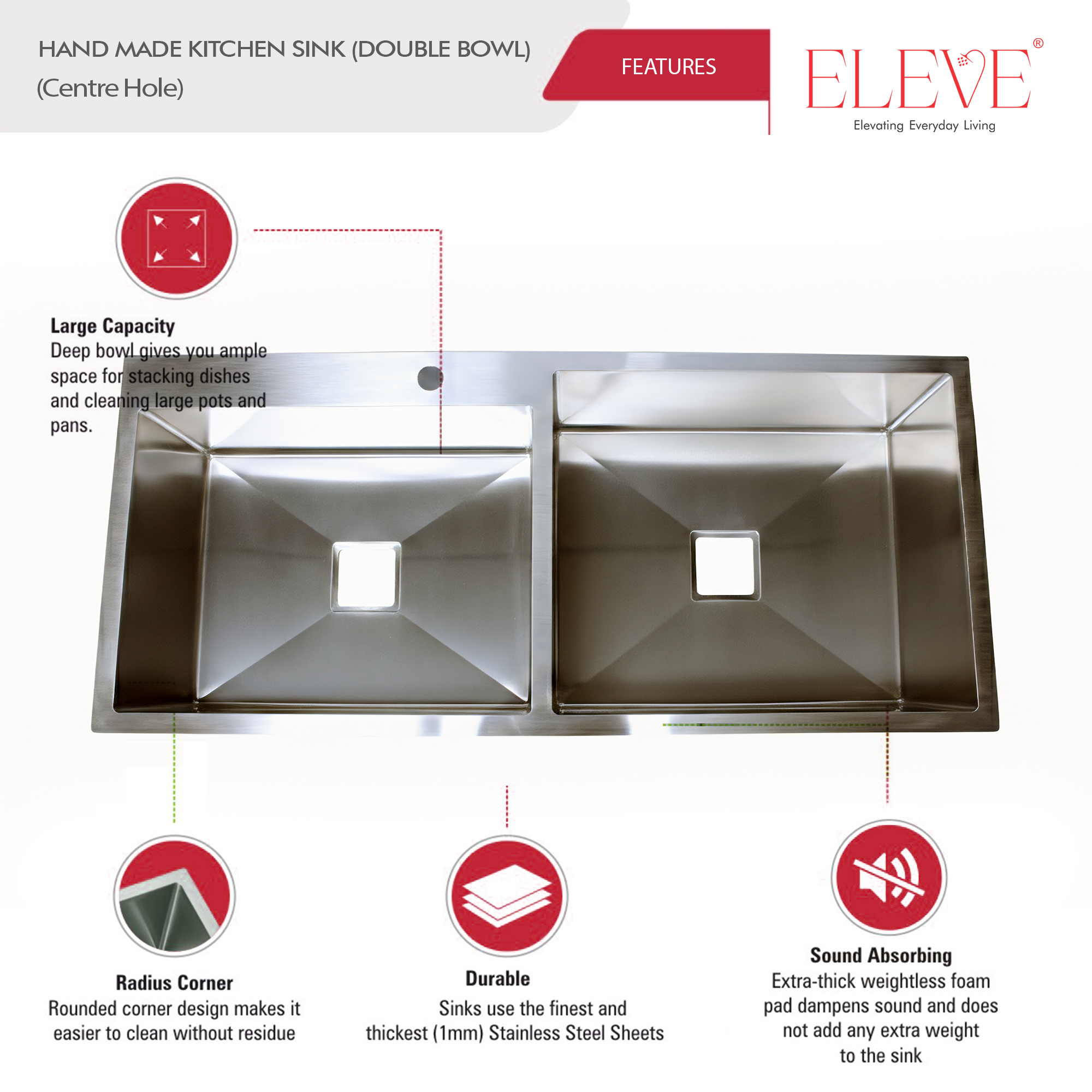 - Upgrade your kitchen with the ELEVE Origin Handmade Single Bowl Sink, crafted from premium 304 stainless steel for superior durability and elegance. Designed with X drain grooves, sound absorption technology, and a scratch-resistant finish, this 18”x16” sink delivers modern style with high performance. Perfect for contemporary kitchens.