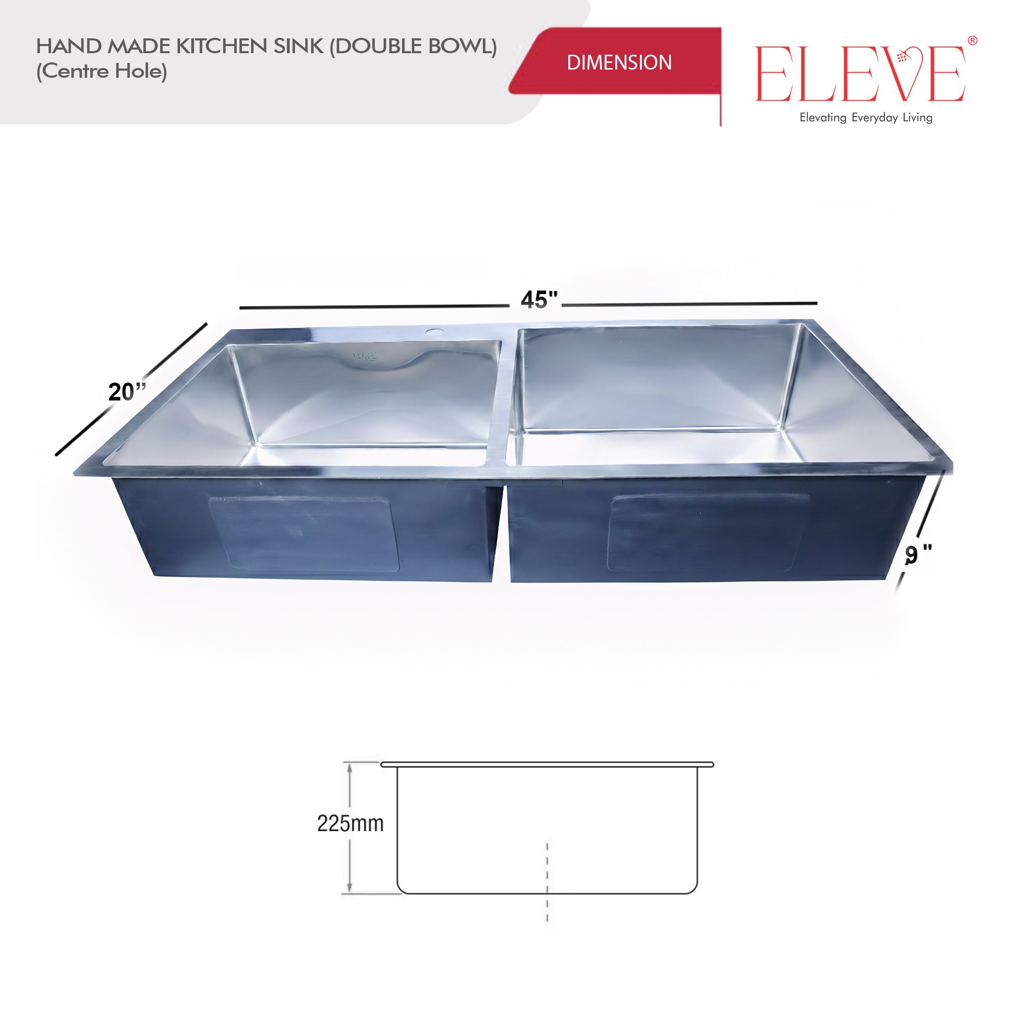 The ELEVE Eminence 48”x18” Double Bowl Sink with Drain Board is designed for spacious modern kitchens. Crafted from premium 304 stainless steel, it features two deep bowls for multitasking and an integrated drain board for efficient drying—combining luxury, durability, and high performance.