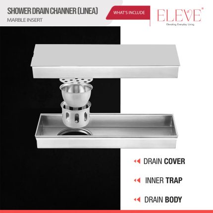 The ELEVE Modulo 30”x4” Marble Insert Shower Drain features a modern tile-in design that blends seamlessly with your bathroom flooring. Crafted from premium 304 stainless steel with a hairline finish, this drain offers superior durability, efficient water flow, and a sleek concealed look.