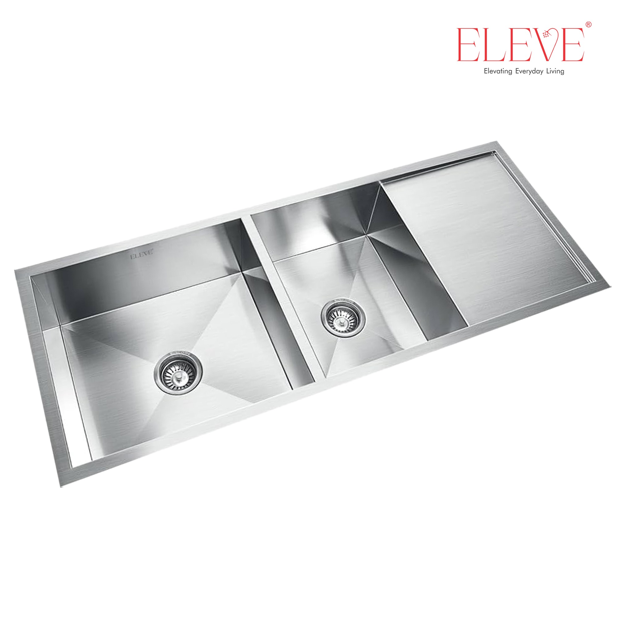 The ELEVE Eminence 48”x18” Double Bowl Sink with Drain Board is designed for spacious modern kitchens. Crafted from premium 304 stainless steel, it features two deep bowls for multitasking and an integrated drain board for efficient drying—combining luxury, durability, and high performance.