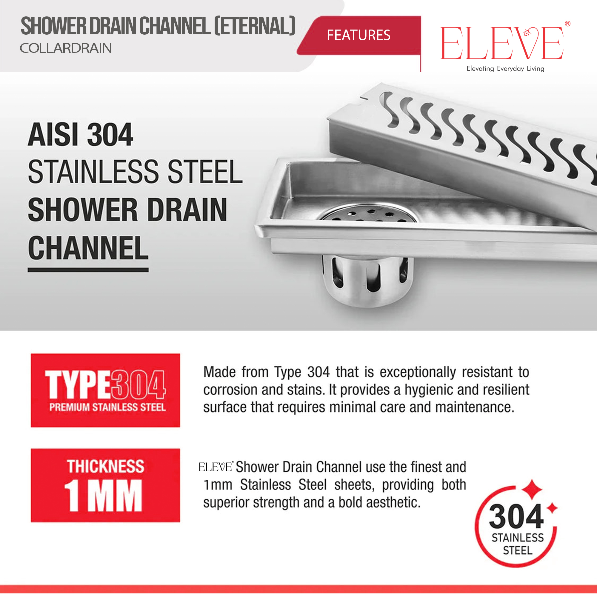 The ELEVE Eternal 12”x4” Collar Shower Drain is crafted from premium 304 stainless steel with a modern wave-pattern cover. Designed with a built-in collar for secure installation, it ensures efficient water drainage, durability, and a sleek hairline finish—perfect for contemporary bathrooms.