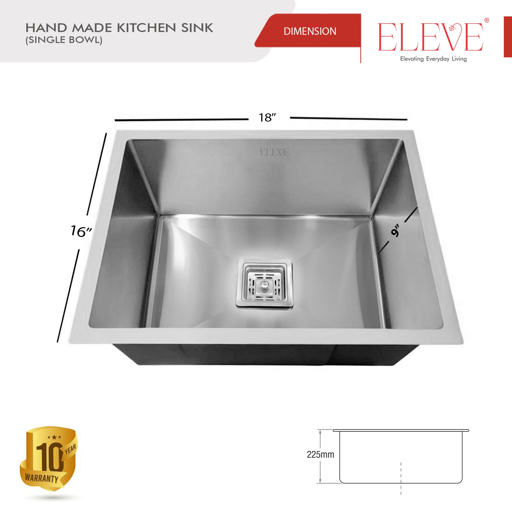 • Upgrade your kitchen with the ELEVE Origin Handmade Single Bowl Sink, crafted from premium 304 stainless steel for superior durability and elegance. Designed with X drain grooves, sound absorption technology, and a scratch-resistant finish, this 18”x16” sink delivers modern style with high performance. Perfect for contemporary kitchens.