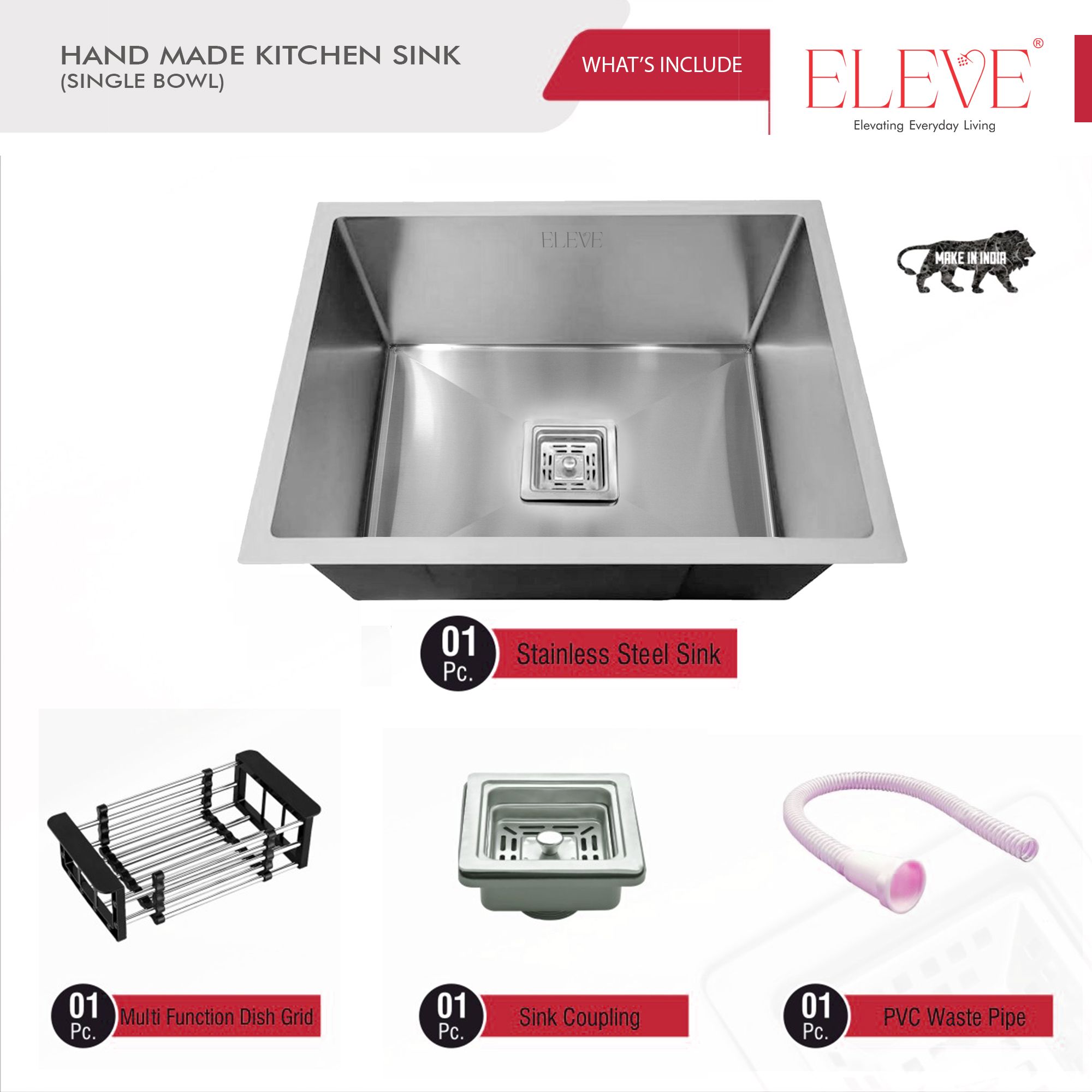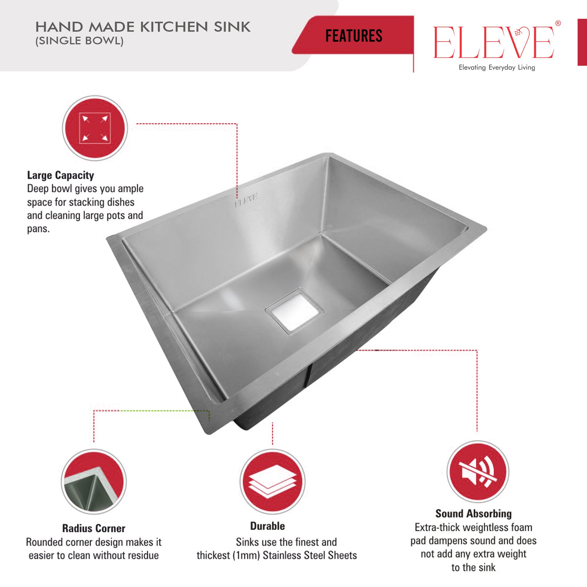 The ELEVE Origin Single Bowl Kitchen Sink is meticulously handcrafted to offer a sleek, modern finish and long-lasting durability. Its sharp zero-radius corners and smooth satin surface enhance the aesthetics of any modular kitchen.