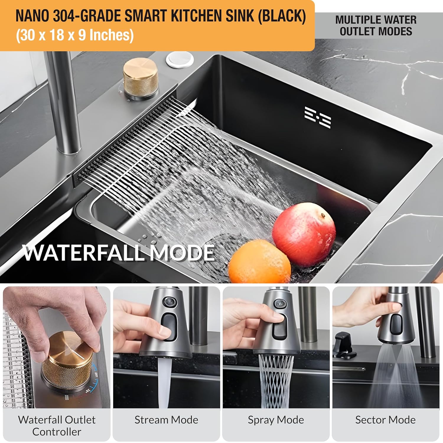 Piano Black Smart Waterfall Kitchen Sink